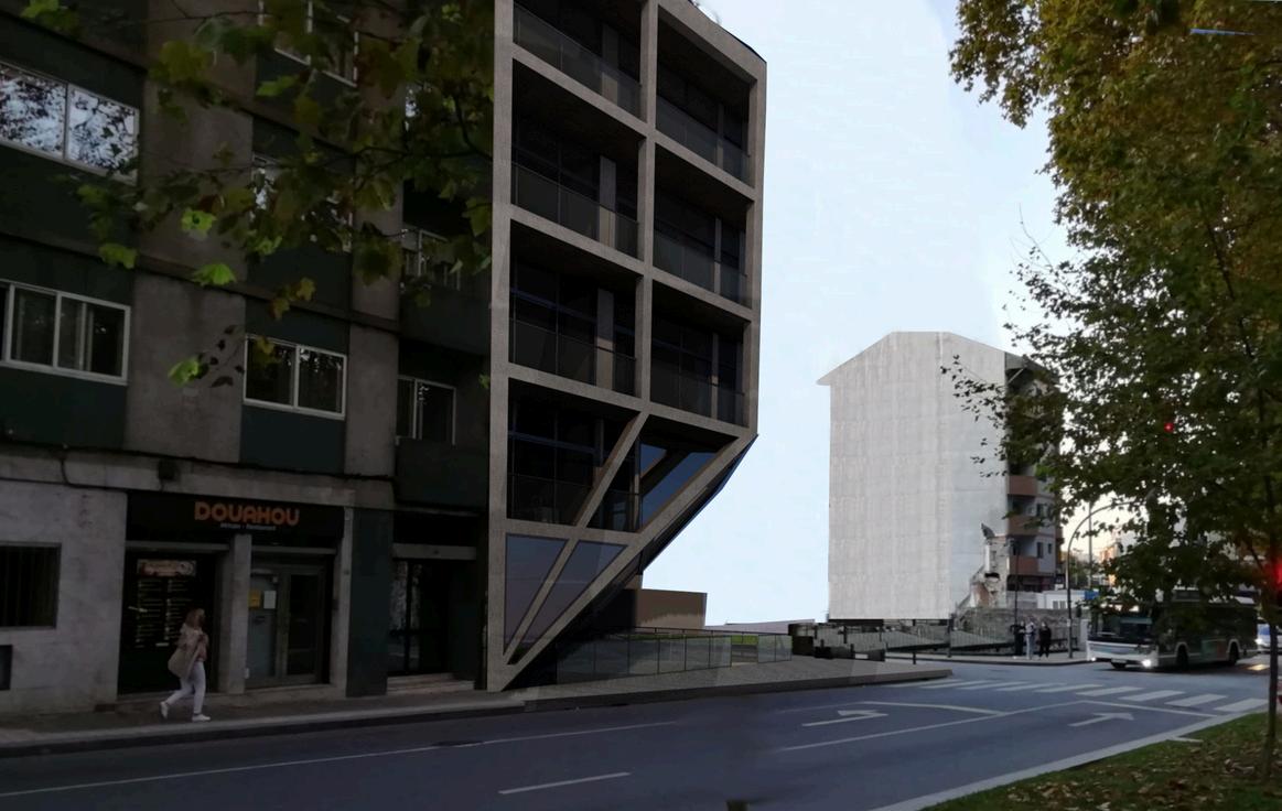 o no cunhal da omaPraça9de m atelier de piso térreo e ados nos pisos o maximizar a residentes e zonas verdes espaços para de veículos de amplia a via stres. zoidal suaviza a enquanto a meiro piso facilita atelier e oferece namento. ui porosidades a aberturas e ndo visualmente doedifício.