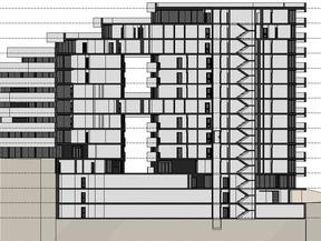 O projeto resultou no desafio de acomodar 80 apartamentos de diversas tipologias numa área de 7500 m² e ao mesmo tempo criar uma transição suave entre as cotas das preexistências desequilibradas.