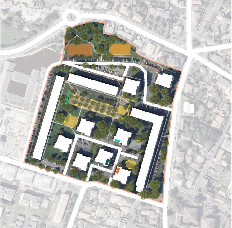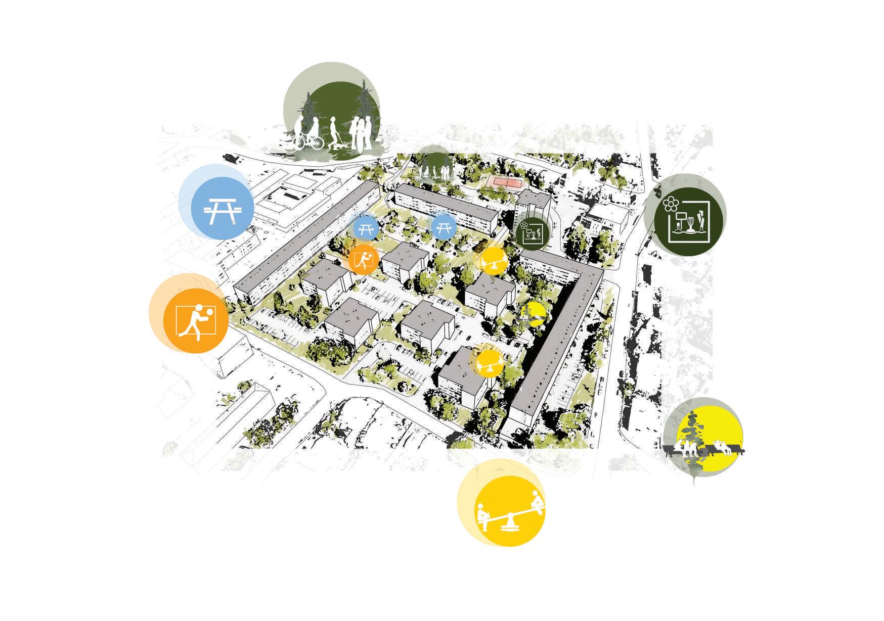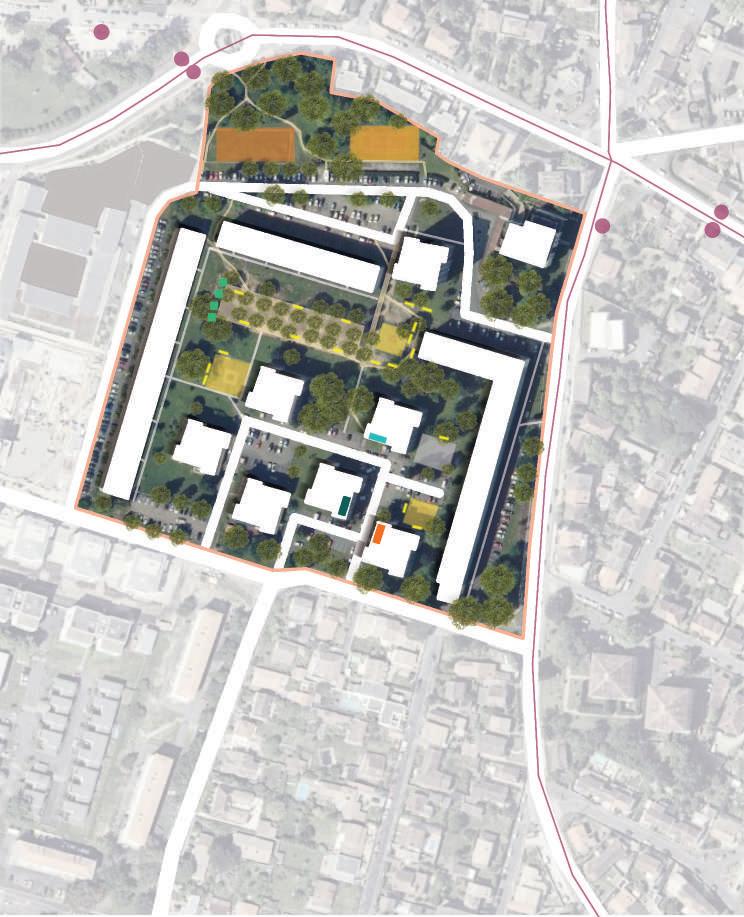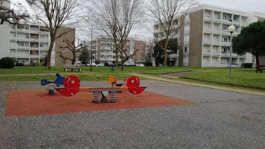 Le centre de la résidence, le «parc central», est en cadré par le bâti et semble coupé de son contexte immédiat. Le lien à la trame verte est inexistant. Ici, la voiture est absente, mais les aménagements et infrastructures présents sont anciens, hors normes ou abîmés. De ce fait, cet espace qui pourrait être qualitatif reste peu approprié par les habitant.e.s. Certains usages décalés ou inappropriés nous ont été rapportés, soulignant un manque d’infrastructures adaptées aux différentes populations et tranches d’âges qui occupent le quartier.