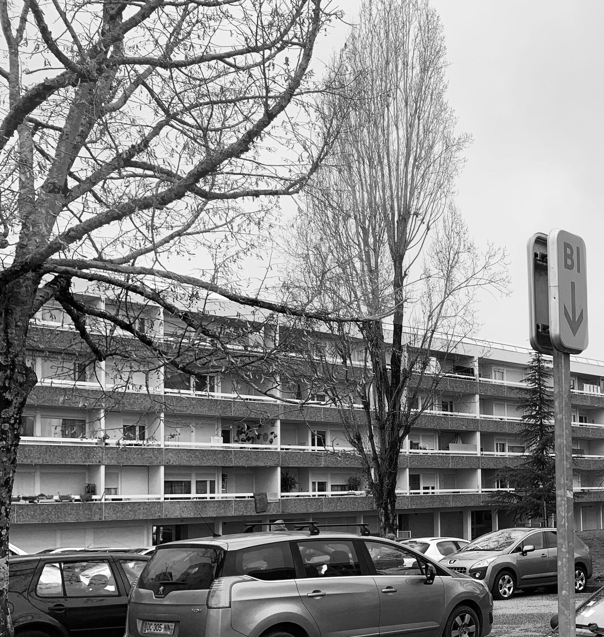 Bien que généreusement végétalisé, la dominance du quartier reste minérale à cause de la part impor tante occupée par le béton, de par la hauteur des édifices datant des années 1960-1970, et également à cause des aires de stationnement. Celles-ci sont nombreuses et entravent la lecture de l’espace pé riphérique de la résidence, et pourtant, un manque est décelé du fait des voitures se garant sur les trot toirs et sur certains espaces enherbés, occasionnant des déteriorations.