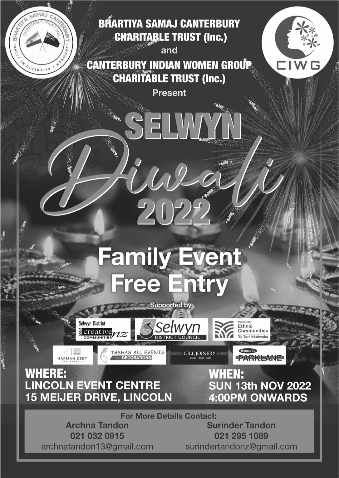 Bhartiya Samaj Canterbury Trust and Canterbury Indian Women Group Trust are organising Selwyn Diwali again this year, with the support of Selwyn District Council, Selwyn District Creative Communities and Ministry for Ethnic Communities. It will be a great opportunity for community to intermingle with each other and give a reason to celebrate something together after Covid. Family friendly event. Entry is free.
