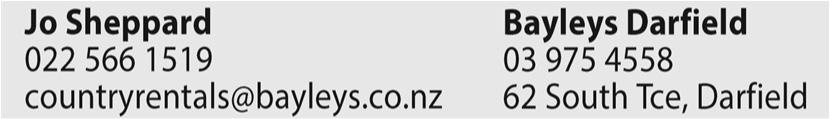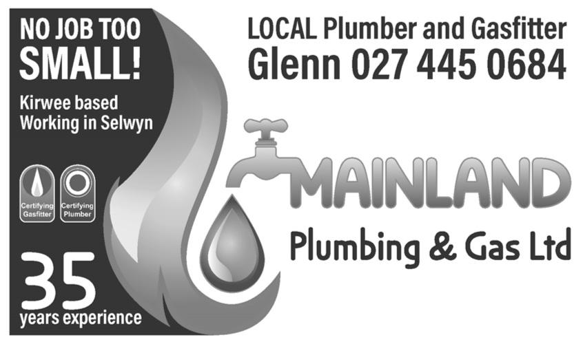 we’ll be there when you need us. guaranteed. on time guaranteed or your first hour is free! conditions apply. david wilkinson registered electrician phone 03 318 1231 fax 03 318 1235 PO Box 26 email sales@electricalcontractors.co.nz kirwee Darfield based with over 38 years of local knowledge and experience Septic Tank Cleaning Jetting Unit for blocked drains Camera Investigations | Port-a-loo hire Office 318 8609 | 0274 338 693 | admin@leechdrainage.co.nz Daily On Site Sales & Servicing Authorised Service Agent for Most Brands since 1996! • Washing Machines • Dryers • Dishwashers • Ovens • Cooktops • Washing Machine Hire from $8 p.w Reg. Service Technician Qualified Certifying Plumber & Gasfitter NEXT ISSUE: Friday 28th October 2022 ADVERTISING DEADLINE: 10am, Tuesday 25th October ‘22 Phone David Barnhill 027 618 2345 or a/h 317 9144 • 25 years experience • Local qualified builder • All types of work undertaken including additions, alterations, new houses, Dale Mayberry Ph: 021 222 2833 All aspects of concreting & all types of finishing DECORATIVE STAMPED COLOURED EXPOSED 0800 752 400 plainspgd@gmail.com • Maintenance • Renovations & new builds • Pump servicing and installation • Water filter installation • Water pump hire • Supply and installation of septic tank systems • Gas and wood fire installation • IQP in backflow prevention • Teatsprayer servicing DARFIELD BASED RURAL PLUMBING SERVICES LTD Simon O’Connell • Certifying Plumber M: 021 048 4799 E: simon@rpsltd.co.nz Darfield based, working Canterbury wide. All Maintenance, Hot Water Cylinders, Log burners, Spouting, Rainwater Harvest, Wetbacks, Pumps, Alterations (new and existing) WATER BLASTING • Per-Paint washdowns • Maintenance chemical soft washes • Moss Treatments (2yr guarantee) • Cleaning of pathways, decks, fences, courtyards and gutters clean outs. • Over 20 Years of Experience. You can also find me on trade me under cleaning for my Tutorials Call me for all your waterblasing needs Bruce 027 275 0238 Page 16 Friday 21st October 2022 DARRELL HICKS BUILDING SIMPLE OR COMPLEX, NOTHING’S A PROBLEM! LBP Licenced 40 years experience ALL RESIDENTIAL BUILDING Phone: 027 495 5688 Email: darrellandannehicks@gmail.com
