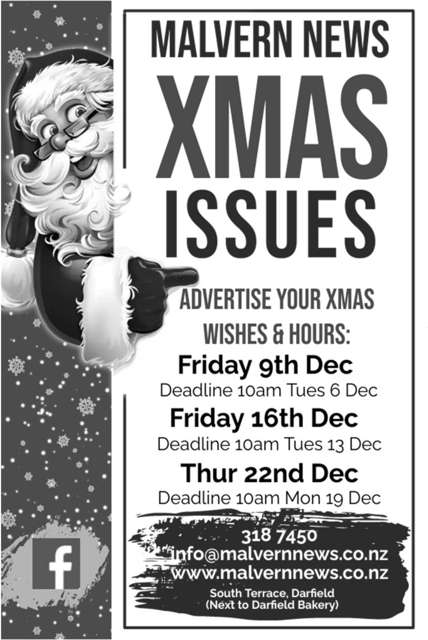 Page 2 Friday 2nd December 2022 Buy online at www.salmonheaven.nz Open: 8am - 5:00pm weekdays| Eftpos Available 165 Hororata Road, Hororata Ph 03 318 0895 | www.salmonheaven.nz CHRISTMAS OPENING HOURS ♦ SATURDAY 10 DEC From 10am - 2pm ♦ SATURDAY 24 DEC From 9am - 12noon • Specialising in farm & trail bikes • Service & repairs on road bikes & small engines • Supply parts for most makes & models 6 South Tce, Darfield (Next to Bridgestone Tyres) Ph 03 317 9521 Mob 027 373 9215 challismotorcycles@gmail.com Normal Hrs: Tues to Fri: 8am till 5:30pm Sat: 9am till 3:30pm Closed Hours: 24th December - 9th January 2023 Reopen on Tuesday 10th January 2023 Challis Motorcycles wishes everyone a very Merry Christmas and a Happy New Year. Thank you for your support. Little nursery - BIG service! Phone Nat or Adrian on 021 258 7241 Ask about our landscaping consultation services and farm planting options. Nursery open over festive season, please phone to arrange a time to visit! Your local 'One Stop Shop' Plant Nursery Supplying - natives, trees & hedging for your... NEW BUILD OLD BUILD FARM