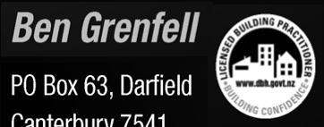 we’ll be there when you need us. guaranteed. on time guaranteed or your first hour is free! conditions apply. david wilkinson registered electrician phone 03 318 1231 fax 03 318 1235 PO Box 26 email sales@electricalcontractors.co.nz kirwee Darfield based with over 38 years of local knowledge and experience Septic Tank Cleaning Jetting Unit for blocked drains Camera Investigations | Port-a-loo hire Office 318 8609 | 0274 338 693 | admin@leechdrainage.co.nz Daily On Site Sales & Servicing Authorised Service Agent for Most Brands since 1996! • Washing Machines • Dryers • Dishwashers • Ovens • Cooktops • Washing Machine Hire from $8 p.w Reg. Service Technician Qualified Certifying Plumber & Gasfitter ■ New Builds ■ Extensions ■ Renovations ■ Kitchen & Bathrooms NEXT ISSUE Friday 9th December 2022 ADVERTISING DEADLINE: 10am,Tuesday 6th December Phone David Barnhill 027 618 2345 or a/h 317 9144 • 25 years experience • Local qualified builder • All types of work undertaken including additions, alterations, new houses, TRADES Dale Mayberry Ph: 021 222 2833 All aspects of concreting & all types of finishing DECORATIVE STAMPED COLOURED EXPOSED RURAL PLUMBING SERVICES LTD Simon O’Connell • Certifying Plumber M: 021 048 4799 E: simon@rpsltd.co.nz Darfield based, working Canterbury wide. All Maintenance, Hot Water Cylinders, Log burners, Spouting, Rainwater Harvest, Wetbacks, Pumps, Alterations (new and existing) • Per-Paint washdowns • Maintenance chemical soft washes • Moss Treatments (2yr guarantee) • Cleaning of pathways, decks, fences, courtyards and gutters clean outs. • Over 20 Years of Experience. You can also find me on trade me under cleaning for my Tutorials Call me for all your waterblasing needs Bruce 027 275 0238 JAMES