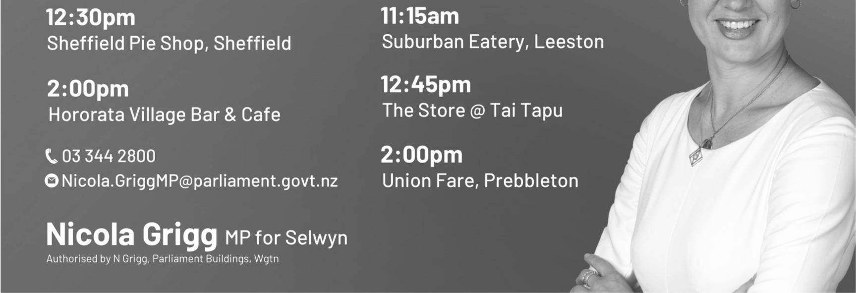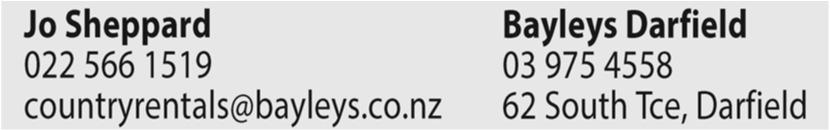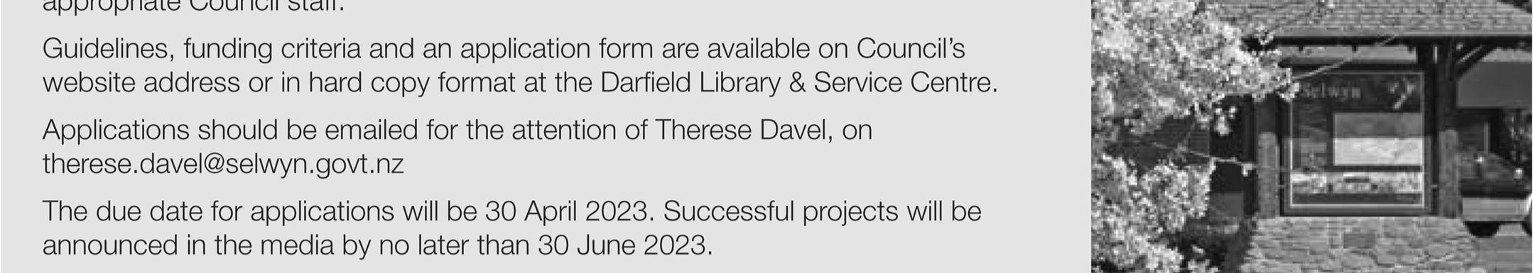 • • CertifyingGasfitters • •• • CertifyingPlumbers• •• • Heat Pumps • Log Burners • Solar • Electrical Service Technician New Builds • System Design • Vehicles Visit: www.selwyngasfitters.co.nz for a full list of services Phone 03 420 1020 • • • • 021 732 331 NEXT ISSUE: Friday 21st April DEADLINE: 10am Tuesday Page Page Page Page 12 1212 12 Friday 14th April 2023 Friday 14th April 2023 Friday 2023 Friday 2023