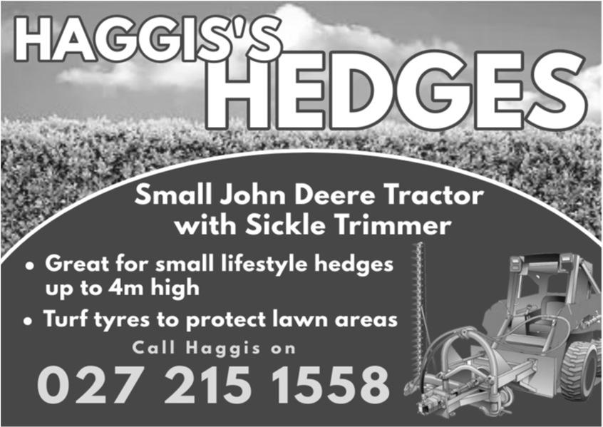 Call Don Call Don today on today on 021 066 3011 021 066 3011 021 066 3011 021 066 3011 or 03 318 2983 or 318 2983 • Half size tractor for easier access • Up to 6m height topped at 5m or less • Branch size up to 50mm • Cutter drops material to side of hedge.