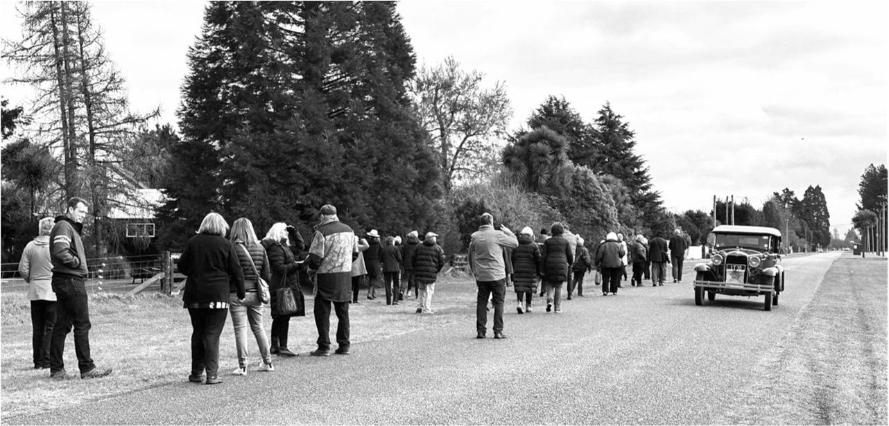 Over60pastandpresentWaddingtonresidentsbravedthebriskcoldwind,lastweekend,todoawalk aroundthesmalltownshipaspartofthe150thcelebrations.Memoriesandstoriesfromthepast werefurtherhighlightedatthepotlucklunchfollowingthewalk,wherephotosandinformationwere ondisplayattheStJohn’sHall.Vintageandclassiccarsalsotookpartintheevent.