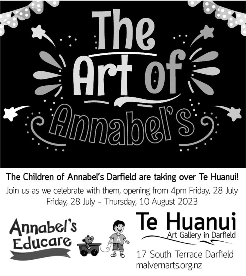 Te Huanui Art Gallery in Darfield are excited to share with the community the works from Annabel’s Education for the first two weeks of August. Annabel’s is a long-time supporter of Darfield Artweek and the Gallery are proud to host this exhibition for them.