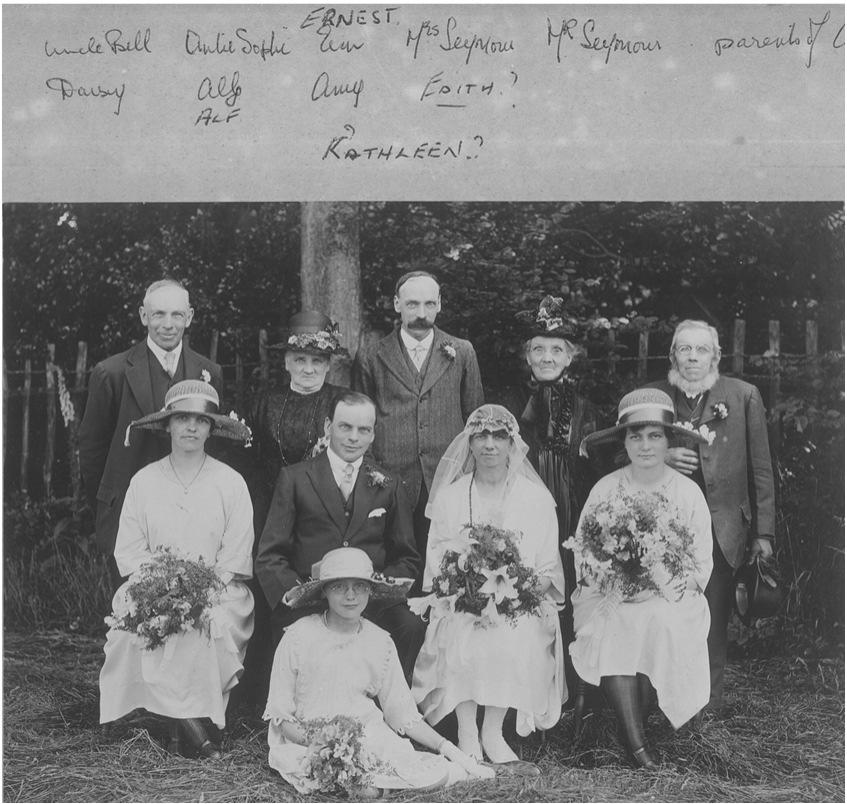 Two are of family groups, one was taken at a wedding. Most ofthepeoplearelabelled with their first names, two have the surname, Seymour. From the clothing, the wedding photo would have been taken in the early 1920s, the family group is earlier, around the turn of thecentury.