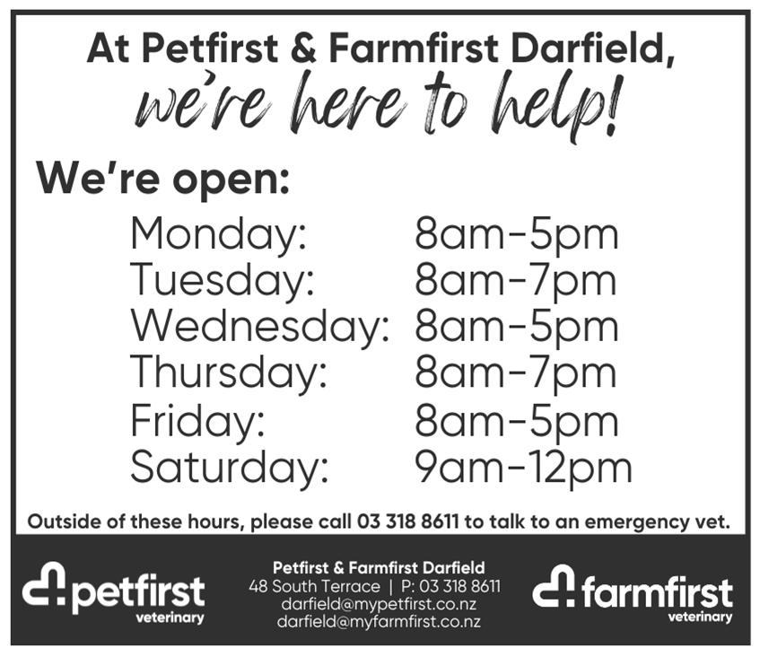 home, working at Petfirst and Farmfirst in Darfield. She enjoys the hands-on nature of rural companion/production animal practice and the strong senseofcommunitythatcomes withit.