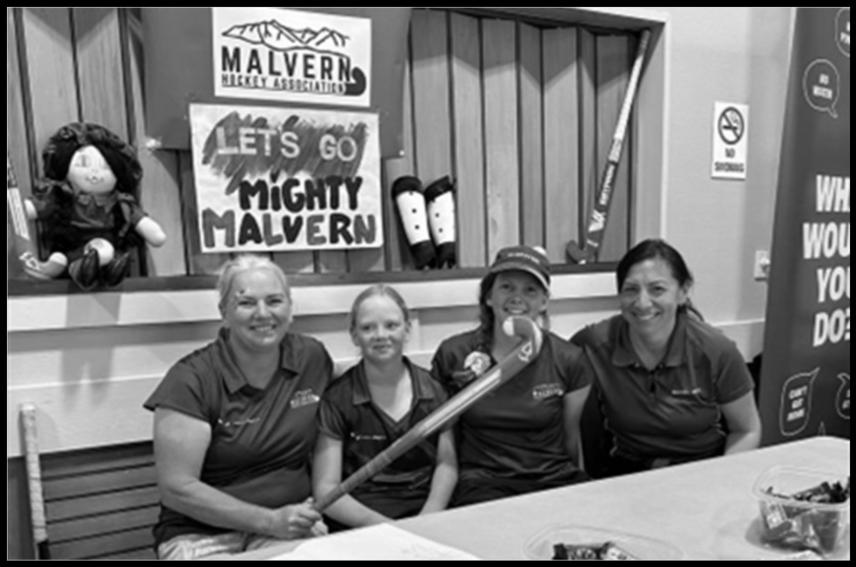 Promoting Malvern Hockey at the Get Set Join event is Amy Truscott, Frankie Truscott (12), Anna Truscott (14), and Lisa McLean.
