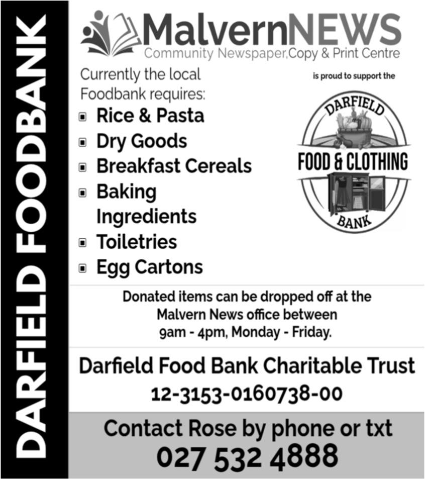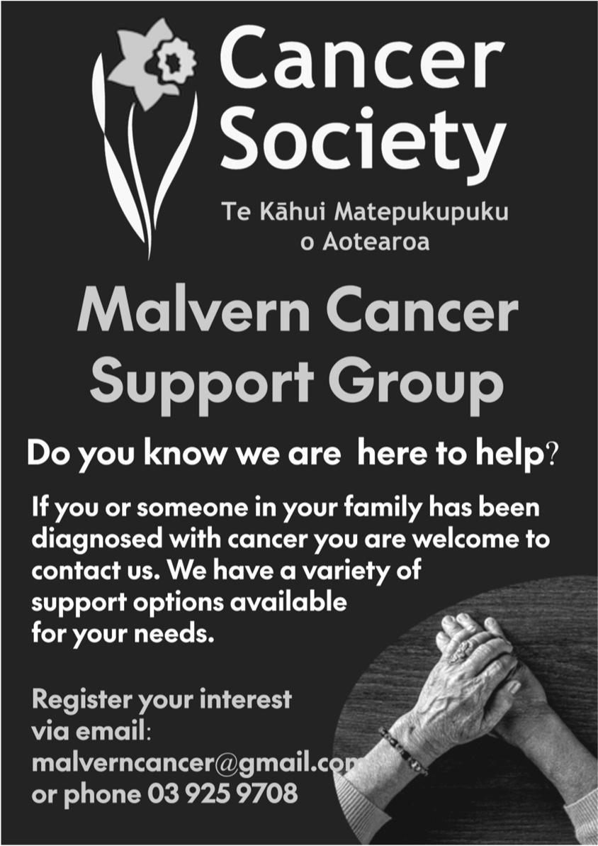The Malvern Cancer Support Group is incredibly proud to support the Cancer Society Selwyn by helping sponsor a vehicle that travels widely throughoutthecommunity. Every single day, this car is on the road from Rolleston, visiting the homes of cancer patients, families, carers, and those needing support across the Selwyn district. It ensures thatnoonefacescanceralone, nomatterwheretheylive. There are many practical and emotional services that the CancerSocietyofNewZealand provides to individuals and familiesfacingcancer. These include volunteer drivers to medical appointments, food vouchers, meal support, counselling services, and personalised guidance from a Cancer Navigator. They also o er support groups,