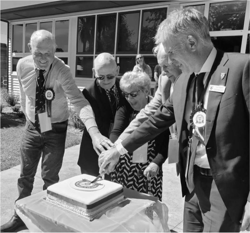 A symbolic Jubilee cakecutting ceremony brought togethergenerations,withfirst -day pupils Bob White, Gordon and Jean Nimmo joined by Principal Andy England and