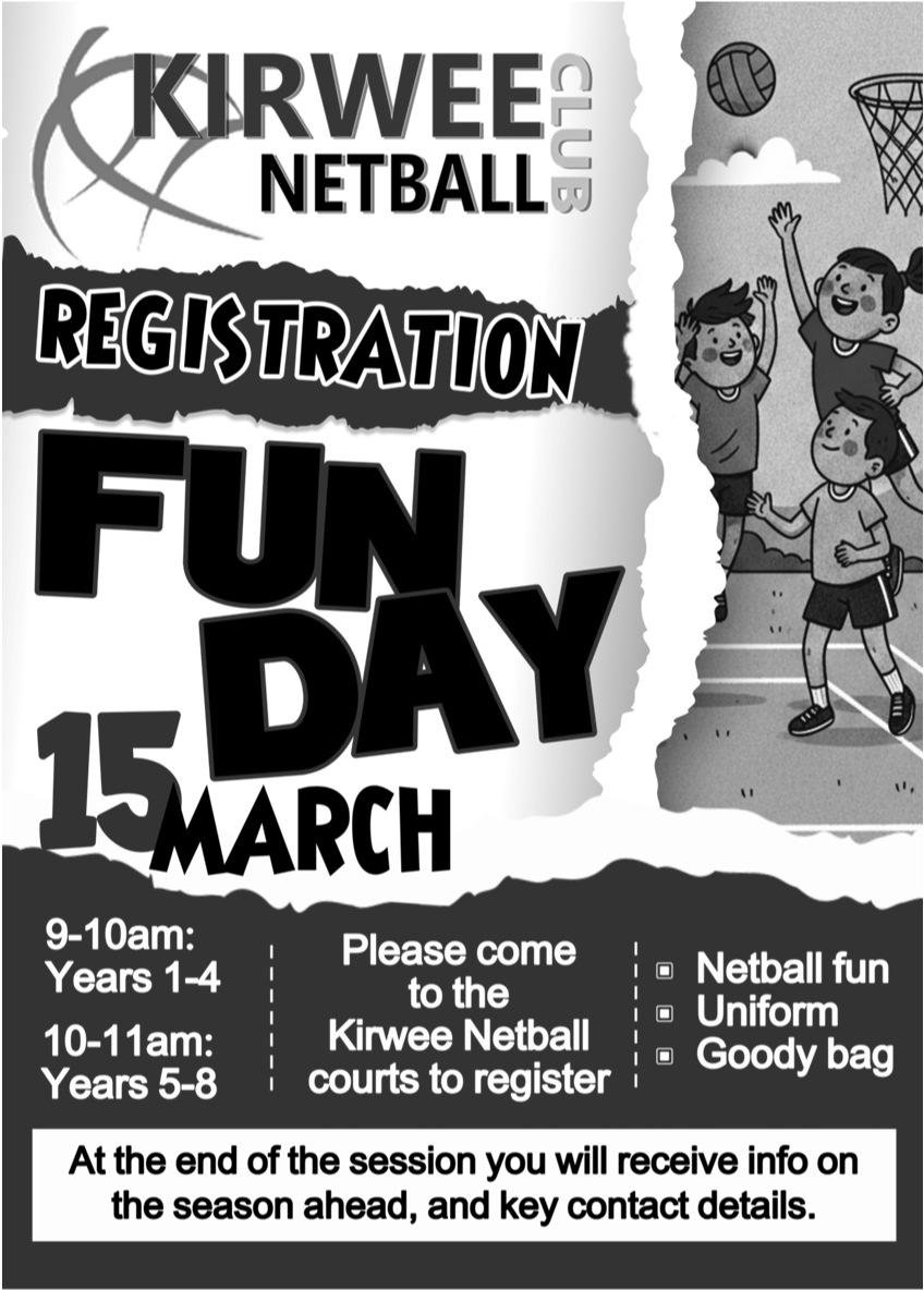 15Mar 9am KirweeNetballRegistrationFunDay KirweeNetballCourts
