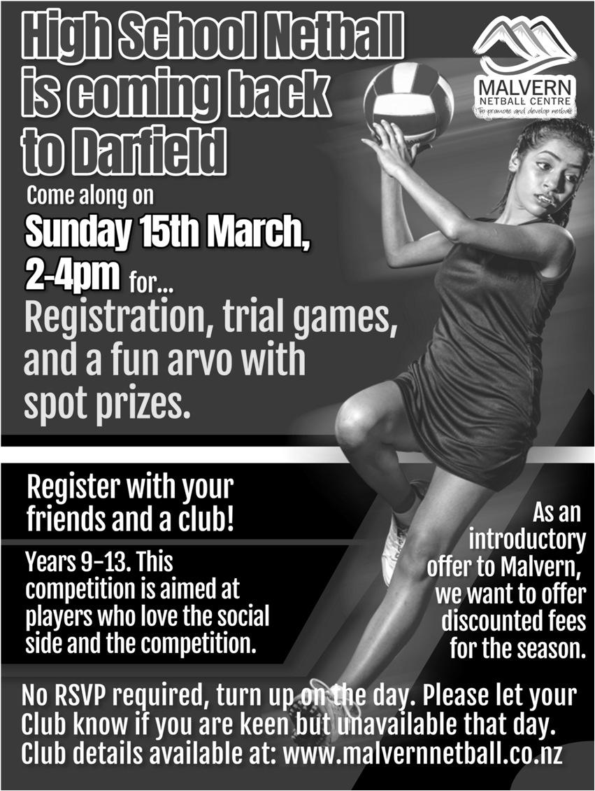 To launchtheseason, Malvern Junior Netball Co-ordinator Ange Cawthray is hosting a fun afternoon on Sunday, March 15, for all high school playersinterestedinplayingat Darfield on Saturdays. This event is a fantastic opportunity to play a few casual games, register with your local club, and even win