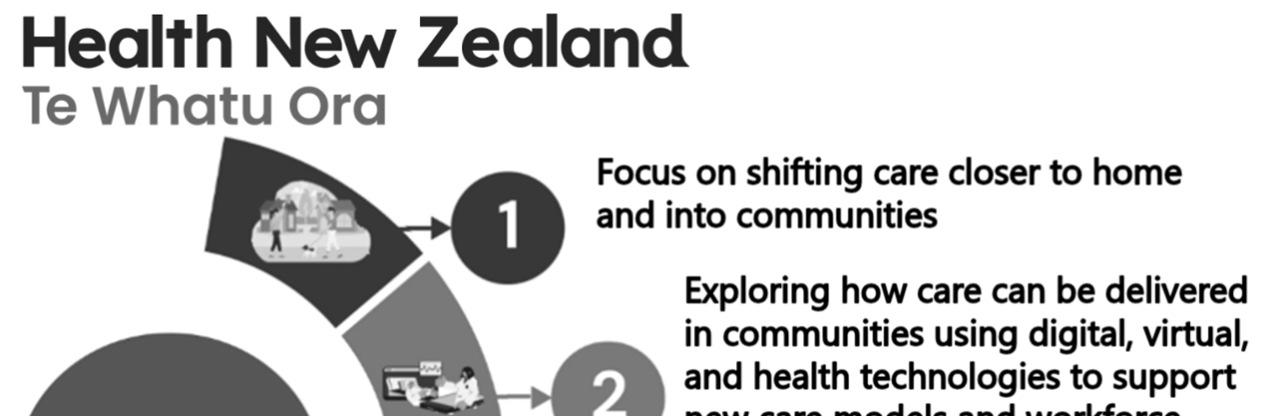 broadmixofservicesavailable locally, including primary care, Hauora Māori services, rural and community-based care, mental health support, maternity and early years services, and care for older people. However, it also reinforced the need to modernise how services are delivered, with a growing focus on shifting care closer to home, increasing the use of digital and virtual health technologies, and redefining the role of hospitals within a more distributed, communitybasedsystem.