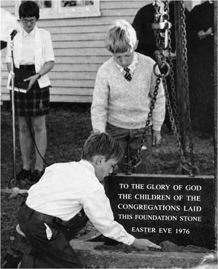 In 1976 Christine Heasley (Anglican), James Reveley (Presbyterian) and Brent Early (Methodist) kneeling, were chosen to lay the foundation stone because children are always the future of the Church.