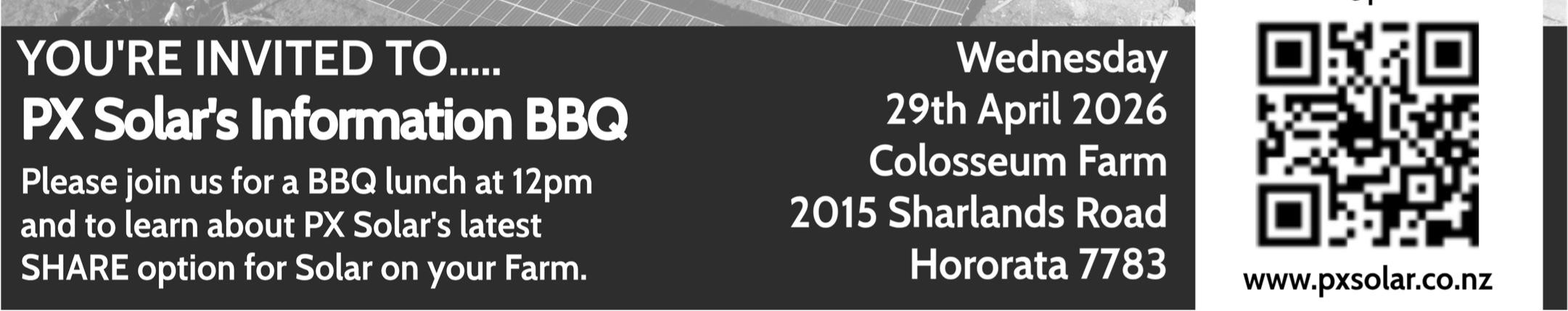 You are invited to join us for a BBQ lunch to learn more on Wednesday April, 29 in Hororata,Canterbury. Please email or text to Please email text to register your interest: register your interest: sales@pxsolar.co.nz or sales@pxsolar.co.nz sales@pxsolar.co.nzor 027 644 9093. 027 644 9093. 027 027