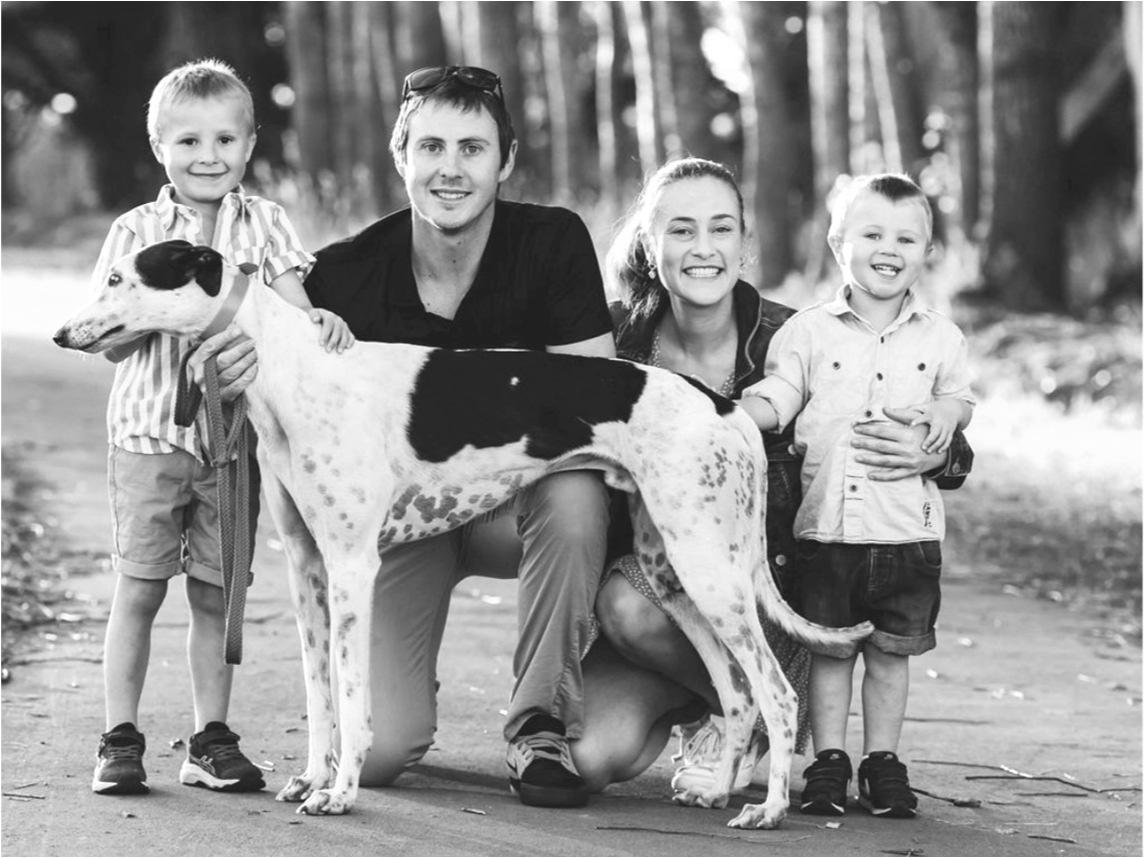 Local family: breeder, owner, handler and trainers Matt Roberts and Sarah Clausen with their children Astle (left) and Joel with Claws in Zorro in front.