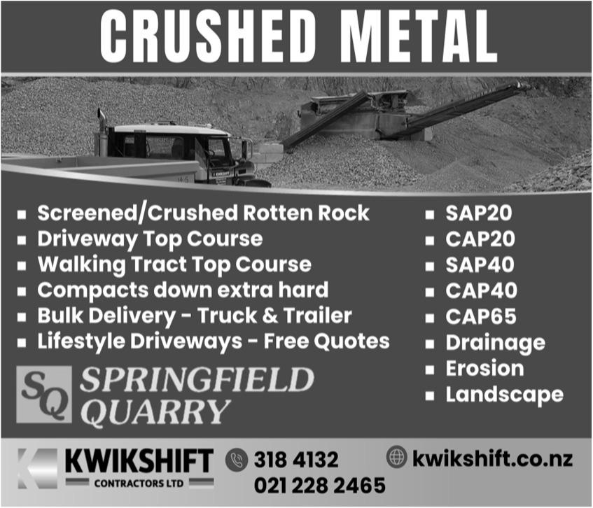 LIFESTYLE LIFESTYLE LIFESTYLE, farm tracks, yards and dairy lanes our speciality. Screened rotten-rock, it’s local and lasts better. Contact the Springfield Quarry today! Phone3184132.