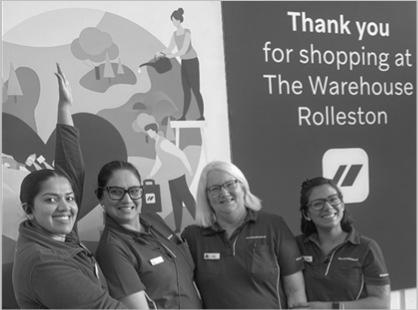 The Warehouse’s Be The Joy campaign and community generosity reminds local Rolleston staff why they love living and working in Rolleston. From left, Ayeshi Croos, Nazia Khan, Kaye Evans and Julz Sanchez.