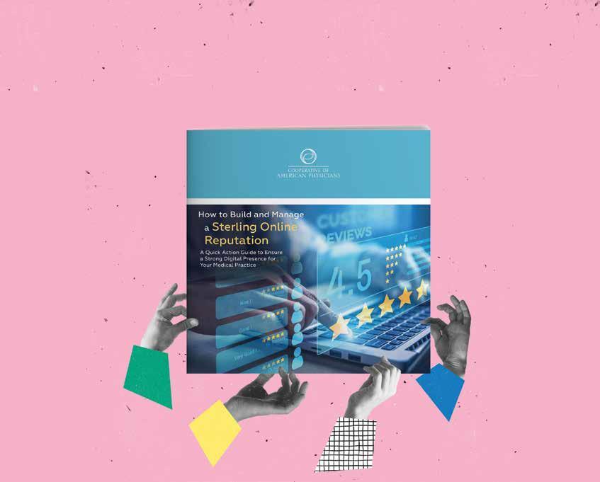 Medical professional liability coverage is provided to CAP members through the Mutual Protection Trust (MPT), an unincorporated interindemnity arrangement organized under Section 1280.7 of the California Insurance Code. What are your patients saying about you? Did you know that 69% of patients won’t consider a healthcare provider with an average online rating under 4.0?* Visit www.CAPphysicians.com/online or scan the QR code. *PatientPop 4 Steps to Improve your Google Reviews Star Rating https://www.patientpop.com/blog/4-steps-to-improve-your-google-reviews-star-rating/ Request your free copy of How to Build and Manage a Sterling Online Reputation and take control of your practice’s digital presence. You’ll learn how to: • Claim and build your online profiles • Manage patient reviews • Optimize your practice website • Implement social media best practices • And more! If you’re not managing your online reputation, your patients are doing it for you!