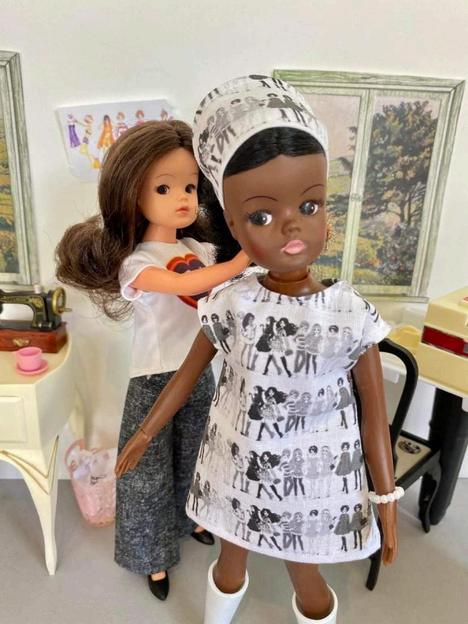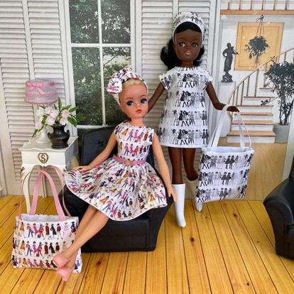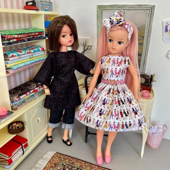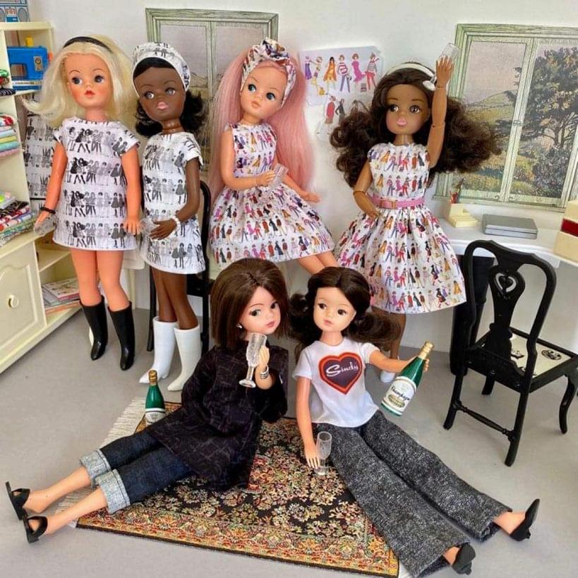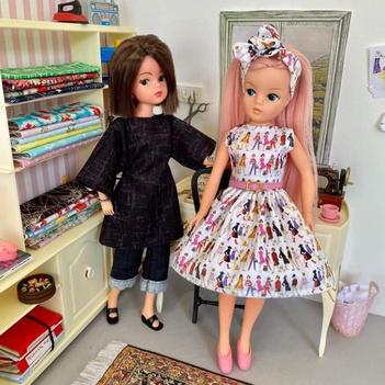 > Fabric designed by Bonita Turner using original Pedigree Sindy illustrations from 1963 and the Kid Kreations illustrations by Rachel Godfroy-Scott from the 2020 Sindy Collectors Range.