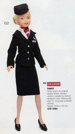 Sindy would fly again a year later in 2003 with British Airways Her outfit was a replica of fashion designer Paul Costello's uniform, first introduced in 1993 A limited edition of 10,000 boxed dolls were produced by Vivid Imaginations The same year New Moons produced their own British Airways Sindy who wore the new cabin crew uniform designed by Julien McDonald She was an in-flight exclusive and cost £10