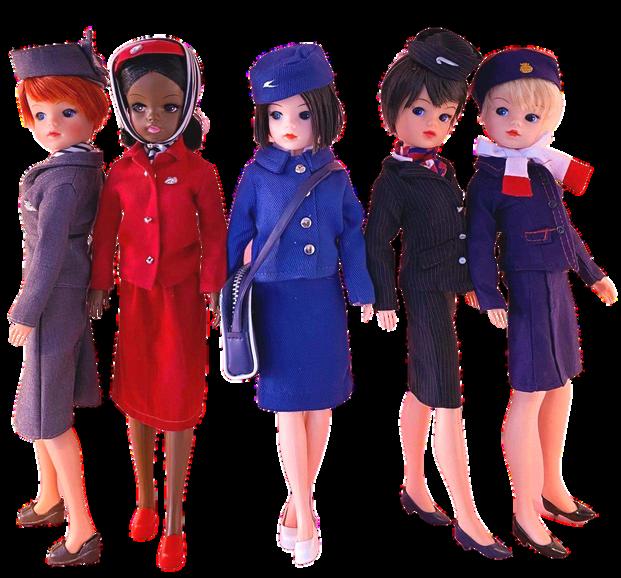 SindyuniformsonlyfromLeft-Right: '1950s BEA Sindy', 2007; 'Virgin Atlantic, 2002; Sindy' 'AirHostess',1966;'British Airways Sindy', 2003;'1970sBEASindy',2007.(PHOTO:GerryBorg)