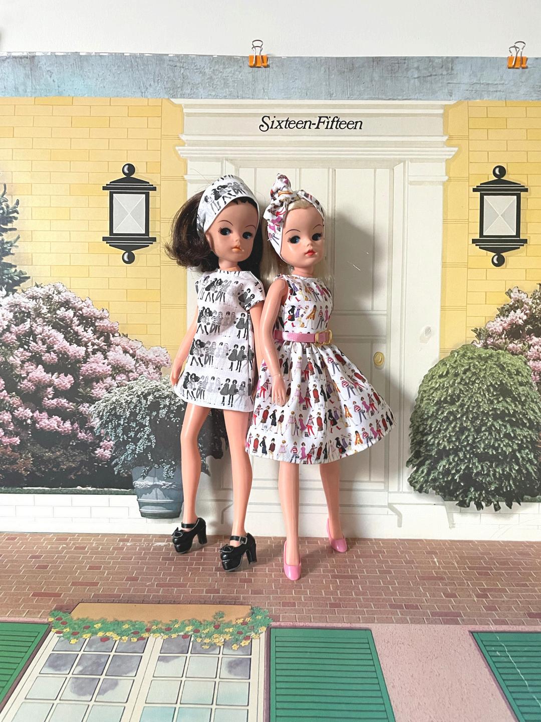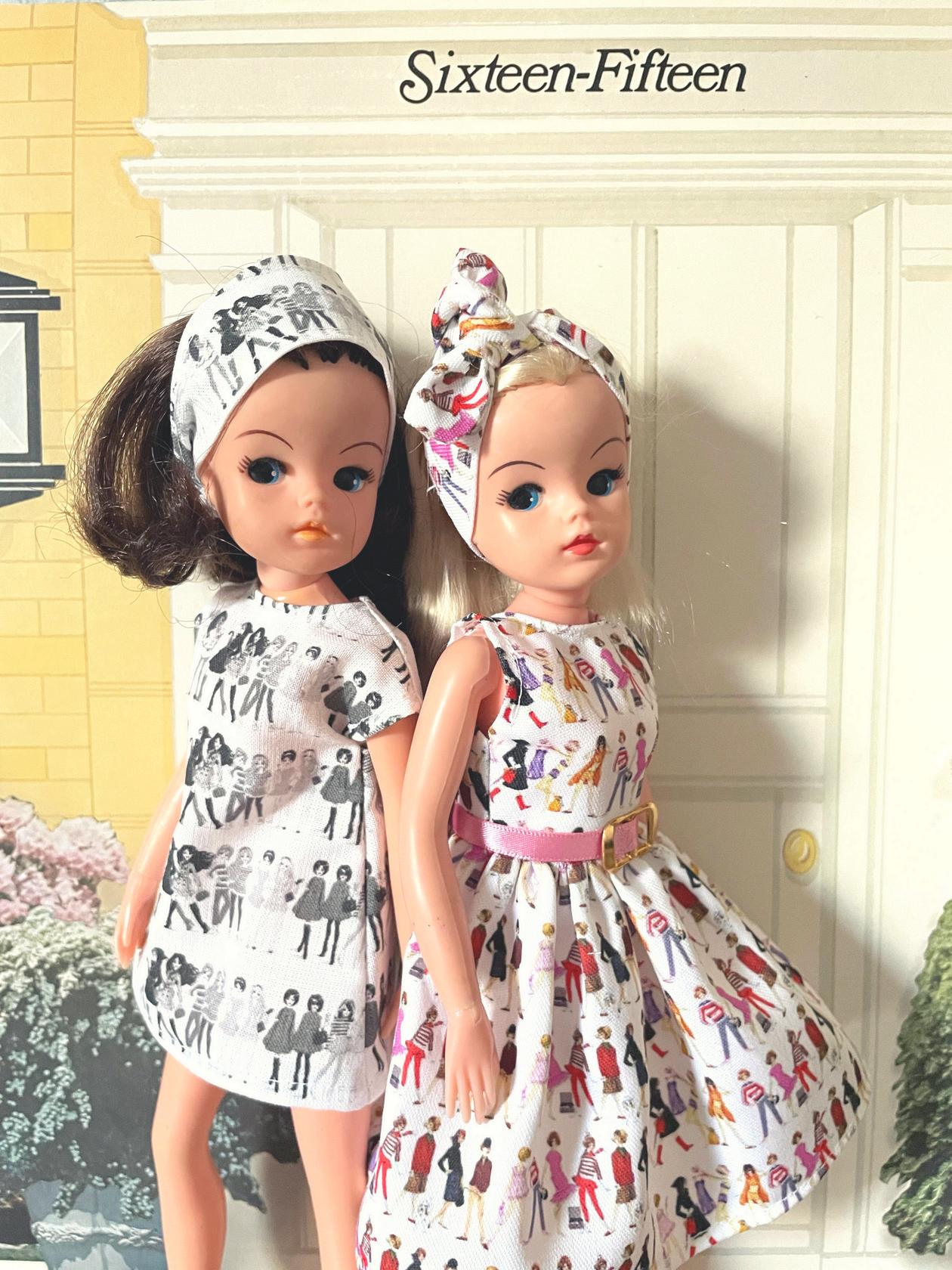 It was all starting to come together beautifully Cathy was so right about using the Pedigree 1963 colour illustrations for a Tea Dress with a matching hair wrap, and the modern Kid Creations illustrations for a Shift and headscarf They were both certain doll designer R G S would be pleased with the final result! Bonita's styling background came in handy when she suggested a pink belt to finish off the Tea Dress
