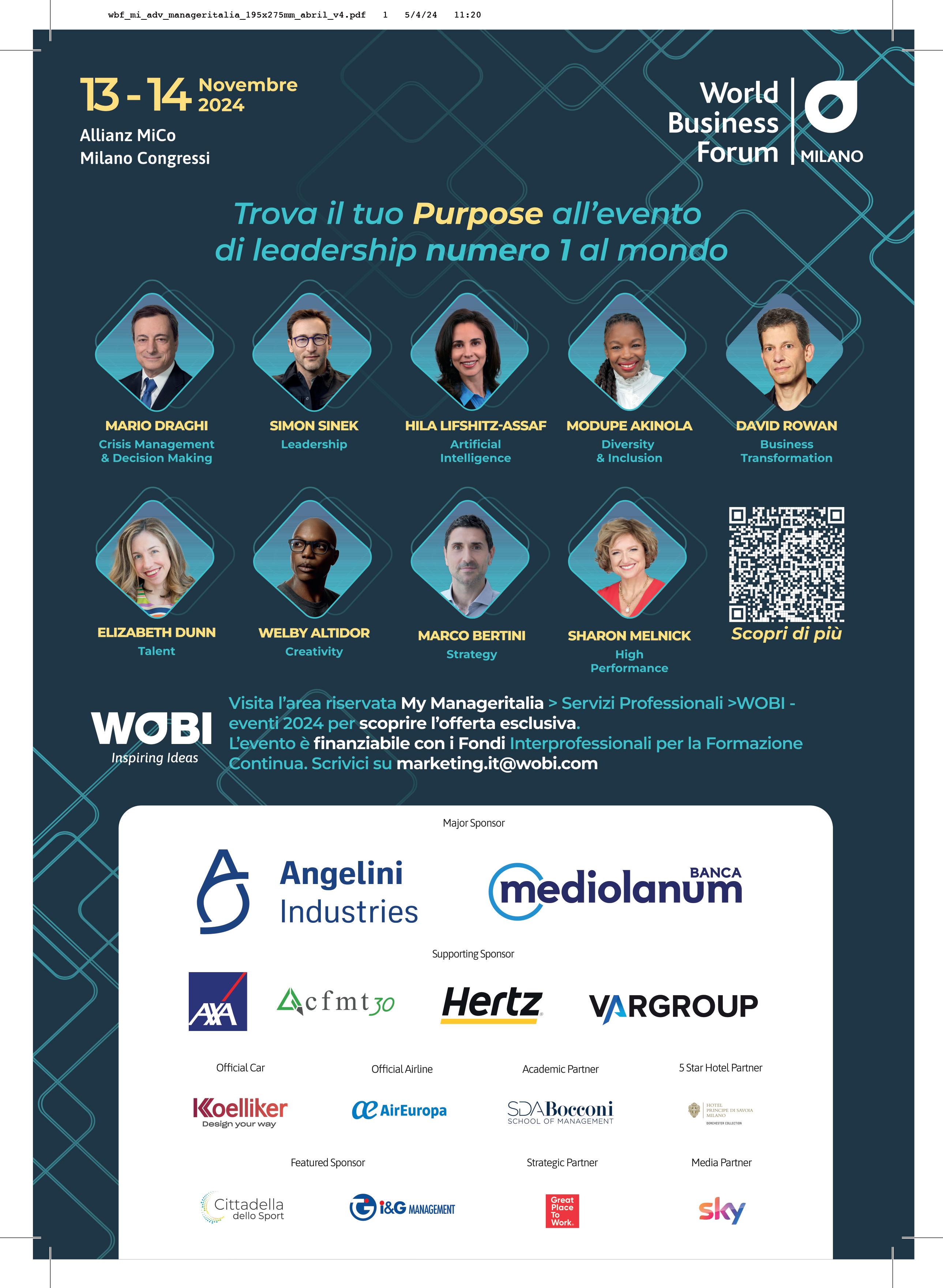 Fondo di previdenza Mario Negri Associazione Antonio Pastore CFMT Centro di formazione management del terziario Fondo assistenza sanitaria dirigenti aziende commerciali MENSILE DI INFORMAZIONE E CULTURA DI MANAGERITALIA Federazione nazionale dei dirigenti, quadri ed executive professional del commercio, trasporti, turismo, servizi, terziario avanzato è online su Scarica l’app dal tuo dispositivo. Ogni mese potrai leggere, commentare e condividere gli articoli che più ti interessano. 5 APRILE 2024 - DIRIGENTE SOMMARIO N. 4/24 Primo piano 6 Manageritalia: non solo servizi 10 Servizi per esserci sempre 14 Consulenze di (gran) carriera 16 Tetris: costruisci la tua pensione, attivamente e da subito 18 Il sistema dei servizi Manageritalia Innovazione 22 Pensa futuro Fisco 30 Guida pratica al modello 730 Eventi 36 Auguri Dirigibile 42 Manageritalia a Motore Italia Focus 45 Domenico Brosio, Stefano Curti, Massimo Mana, Giovanni RubinoImprese, manager e territori Economia 48 Terziario e manifattura, insieme per la doppia transizione Interviste 53 Ana Mazzeo - Illuminare il futuro del management 58 Paola Caiozzo, Paolo GuenziCommerciale e vendite: un ruolo in continua evoluzione Manageritalia 75 Rinnovo ccnl terziario: le novità per i quadri Assidir 78 La fiscalità delle polizze Cfmt 80 Corsi di formazione 81 Neodirigenza: aspettative, responsabilità e sfide 67 LA RIVISTA DI MANAGERITALIA MENSILE DI INFORMAZIONE E CULTURA DEI DIRIGENTI, QUADRI ED EXECUTIVE PROFESSIONAL DEL TERZIARIO Poste Italiane Spa Spedizione in abbonamento postale - Decreto Legge 353/03 (convertito in Legge 27/2/04, n. 46) art. comma 1 DCB/MI € 2,20 (a bonamento annuo 16,50) SERVIZI PER ESSERCI SEMPRE MANAGERITALIA: NON SOLO SERVIZI TETRIS: COSTRUISCI LA TUA PENSIONE, ATTIVAMENTE E DA SUBITO N. 4 APRILE 2024 CONSULENZE DI (GRAN) CARRIERA IL SISTEMA DEI SERVIZI MANAGERITALIA 20 ROI to read 28 Osservatorio legislativo 62 Pillole di benessere 63 Arte 64 Libri 65 Letture per manager 66 Lettere RUBRICHE