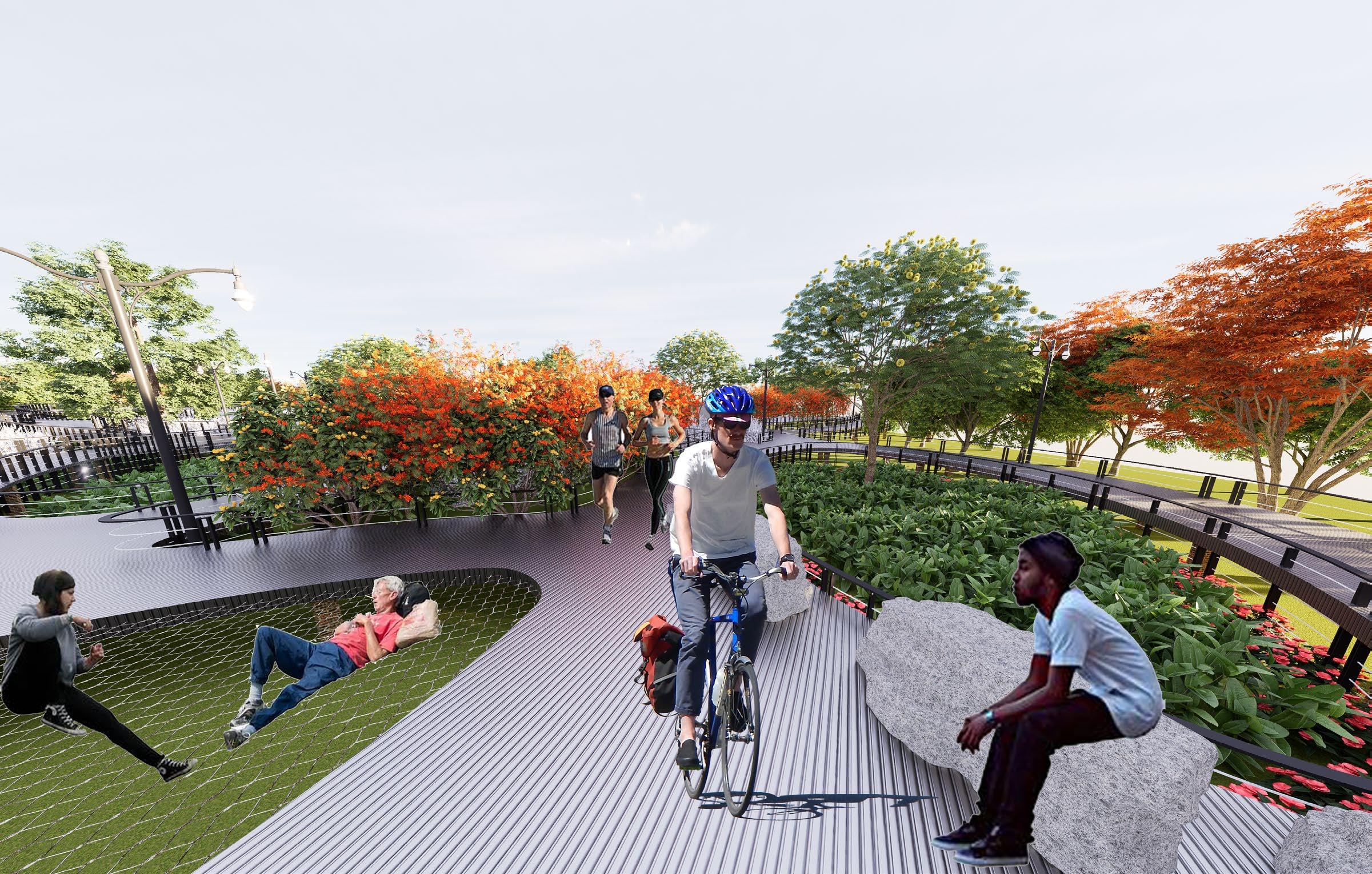 The view from the promenade offers a picturesque panorama, showcasing the users as they leisurely enjoy the expansive vistas afforded by the newly constructed decks. From this vantage point, one can see people scattered across the various levels of the promenade, savoring the fresh air and the stunning scenery. The decks, thoughtfully designed and meticulously crafted, provide an ideal setting for relaxation and reflection.
