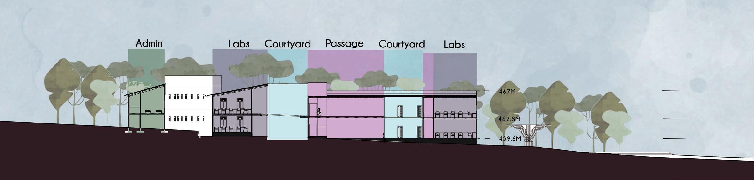 The south western facade of the academic block is protected with the help of fins which helps in cutting of the hash sun radiation into the space. The space below the extruded blocks acts as a space for the students to interact and relax during their breaks and after lectures. The platforms provided are to nourish and the artistic abilities within the students.