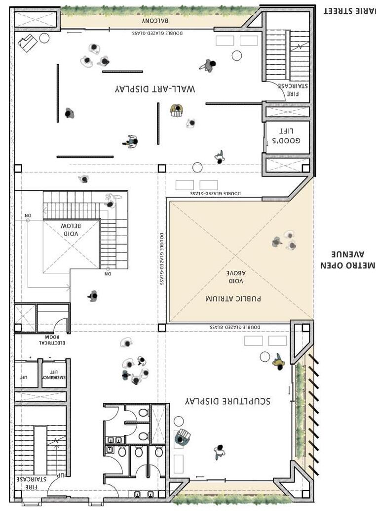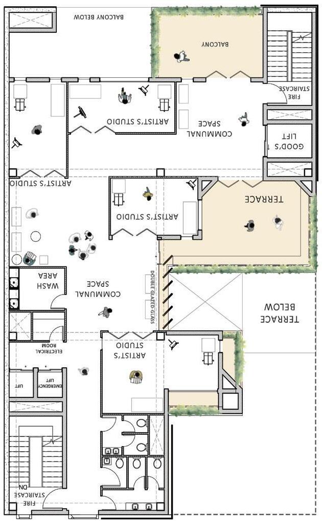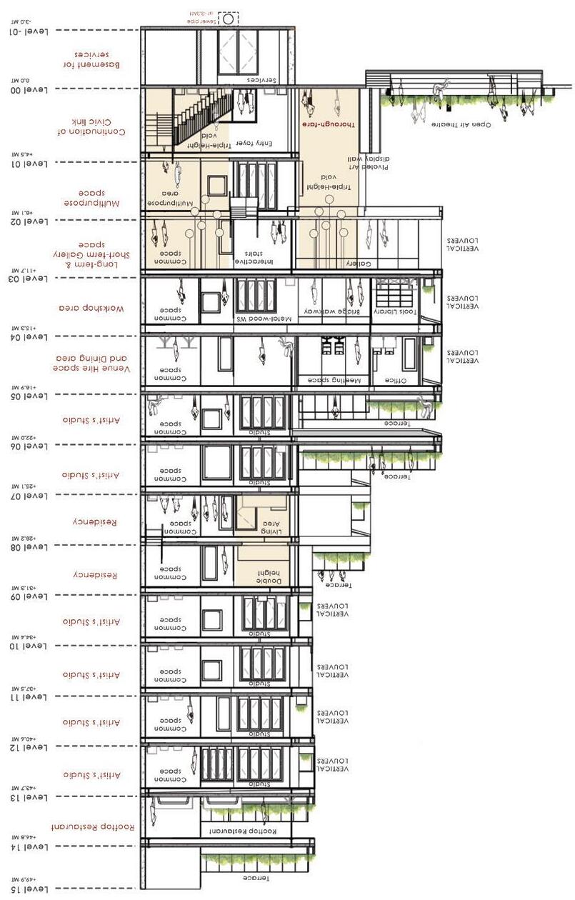 The programmatic requirements of the project are divided based on the interrelationship of functions, vertical connections between them and the relationship between revenue generating spaces and spaces which uses those revenues. Operational timings for the institute will be 24x7 for the artists while for the general public it will be from 8am to 7pm which gives them time after office hours to com e to the PAS.