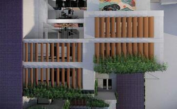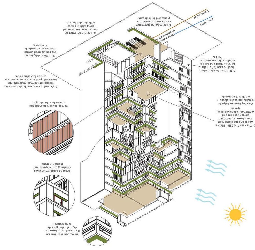 - Vertical louvers on the façade mitigate harsh western sun, while the stepped northern facade provides self-shading to interior spaces. These stepped areas also accommodate vegetation, contributing to passive cooling.