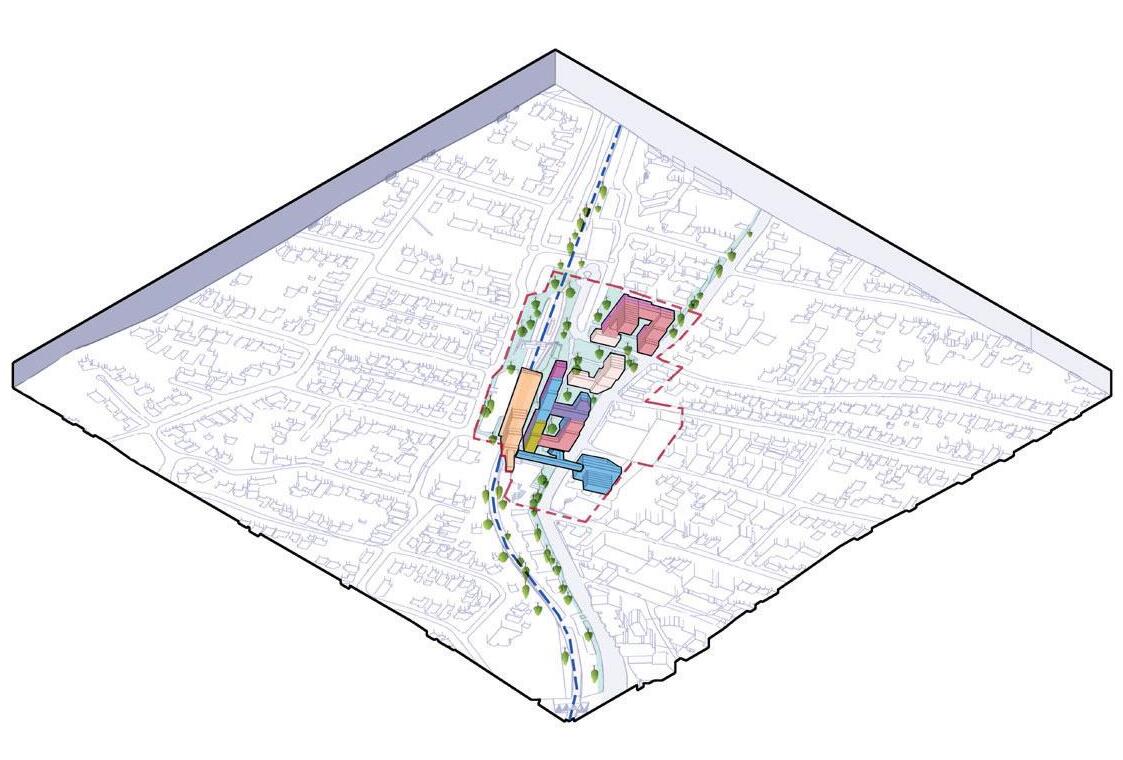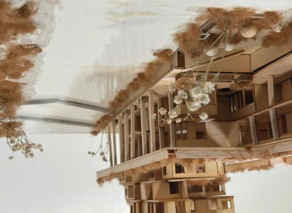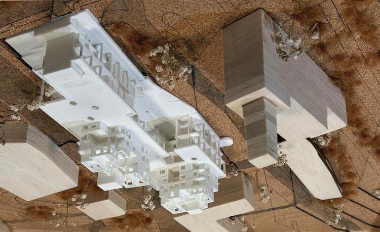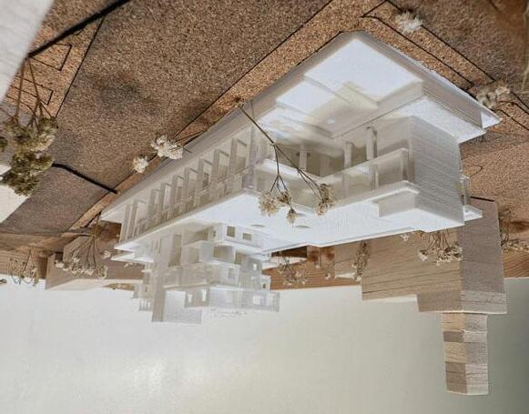 The site model was made to understand the scale of the surrounding buildings and how the proposed design sits withing its conte xt. The massing responds to the predominantly two-three storey built fabric, while the upper levels are stepped and reduced in scale, creating a tower-like form that minimises visual bulk and integrates s ensitively with the surroundings while meeting the requirements of the site.
