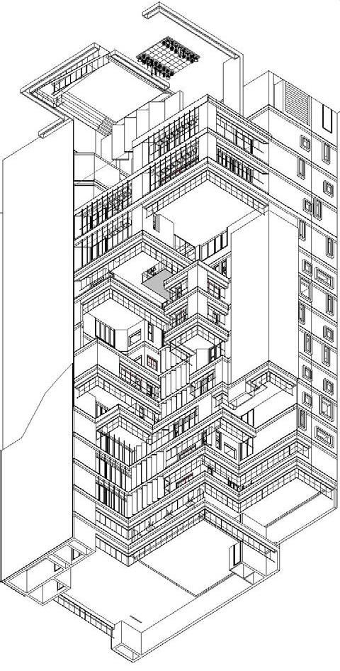 Top Isometric View of the Building tectonics and facade details (North-west corner)