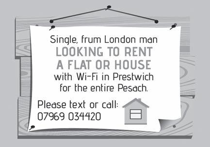 ONE BEDROOM FLAT WITH KOSHER KITCHEN AND LIVING ROOM. Fully furnished, linen and towels provided. In the heart of Sedgley Park close to all shops and shuls. Ideal for Executive Businessmen and Mechutonim. Rent includes bills. 01618321310 ◄
