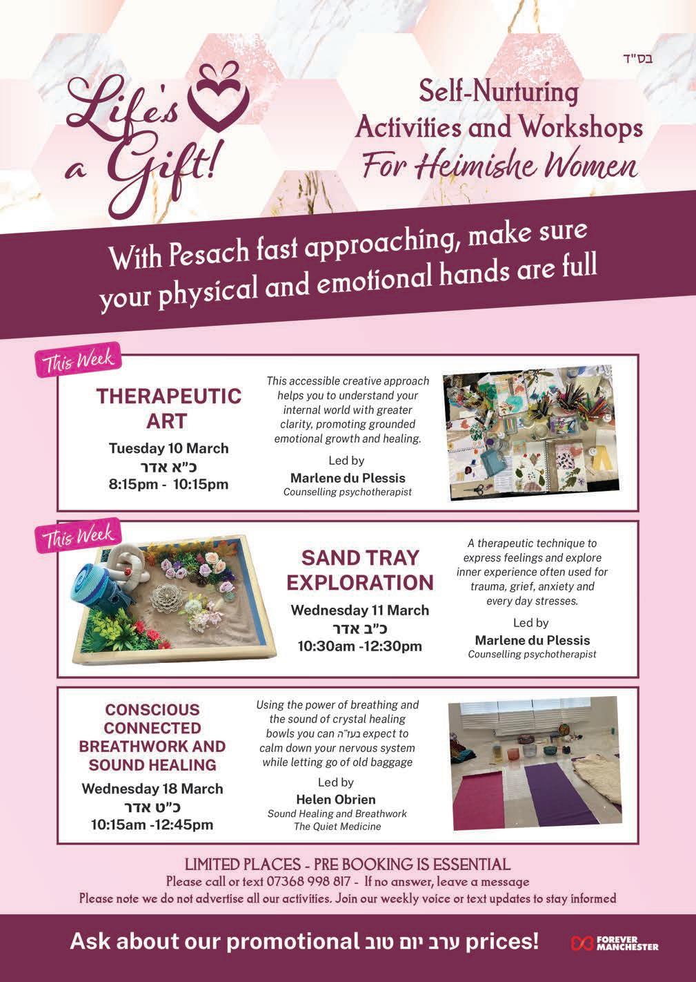 ACTIVITIES & GROUP HEALING for Heimishe ladies.For programme details please call Mrs Fried 0161 708 0246 ◄