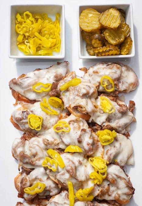 There are many variations on this infamous sandwich. It comes down to four main ingredients: steak, veggies, cheese, and bread. Some will say steak with provolone using only caramelized onions is most authentic when others prefer grilled peppers with their onions then smothered in Cheez Whiz. I’m a firm be liever in if it’s something you find delicious, that will be the best version. I took a few liberties myself by adding the slightest bit of pan gravy in with the meat mixture (to prevent drying out), serving on slices of French baguette as opposed to Italian sub rolls, then garnishing with sliced pepperoncini. The biggest key to making this sandwich successful is slicing the steak as thin as possi ble before grilling. I would even recommend throwing it in the freezer for 20-30 minutes to help firm the meat before slicing. Instead of using a large Italian sub roll, I like to top slices of French baguette before throwing in the oven. The topping will protect the bread from burn ing and will keep it still soft and chewy like a sandwich (this is not supposed to be crostini!).