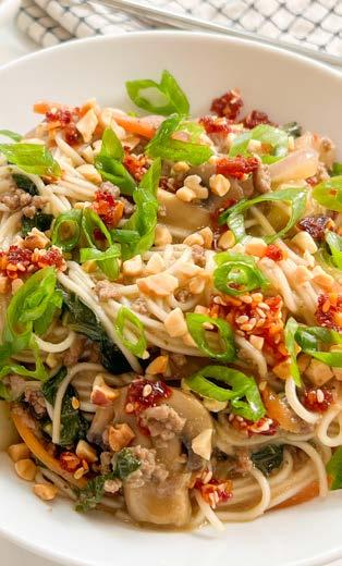 Traditionally, dan dan noodles are built with a spicy sauce, chili oil, pickled vegetables, ground pork, and scallions spooned over thin wheat noodles. I took a few liberties (as one should in the kitchen). I added extra vegetables, because I unapologetically love vegetables, and swapped in lean Manitoba ground beef. Its rich flavour stands up beautifully to the punchy ingredients while keeping the dish hearty, balanced, and proudly local.