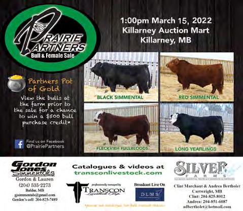 Graeme Finn, Union Forage .........................................................403-312-2240 Amber McNish, Union Forage ......................................................204-264-0609 Jonathan Bouw, Edie Creek Angus .............................................204-471-4696 Jason Bednarek, 2B Land & Cattle ..............................................204-768-0184 Ben Fox, Fox Technologies.................................204/638/4181 / 204-647-5060 Ken Van Driesten, Nutrisource/Dairytech/Bullseye ...................587-727-0433 Michael Mott, Michael Mott Livestock ........................................204-861-0319 Joey Bootsman, Bootsman Ag Enterprises ................................204-720-8386 Darren keown, 3K Holdings ..........................................................204-937-7333 Scott & Darryl Perkin, Perkin Seed & Soil Company ..................204-534-8137 YEAR ROUND Forage and Grazing PERENNIAL FORAGES • ANNUAL COVER CROP FORAGES • DROUGHT GRAZING FORAGES Toll Free: 1-877-COW-CHOW WWW.UNIONFORAGE.COM GRAZE YEAR ROUND Perennial Forages | Annual Forages High Performance Alfalfa | Hybrid Fall Rye WWW.FARMGATETIMEDAUCTIONS.CA ONLINE Bull Sale MARCH 2022 4-5 TH TH of OfferingYEARLING & TWO YEAR OLD GELBVIEH BULLS bulls are available for viewing at the farm anytime vist our website jsjlivestock.com JAMES:431-740-5443 | SHAYLA:204-741-0018