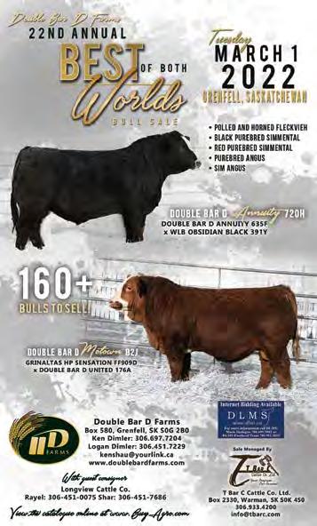 19 CATTLE COUNTRY February 2022 www.mbbeef.ca 43rd Annual General Meeting FEBRUARY 10, 2022 Register at: mbbeef.ca JOIN US ONLINE 58th Annual Manitoba Test Station Bull And Female Sale March 26, 2022 Starting at 1:00 p.m. sharp MANITOBA LIVESTOCK CASH ADVANCE INC. Interest Free Loan Advances available up to $100,000 www.manitobalivestock.com Producer total Advance Limits have been increased to $1,000,000 #212-530 Century St. Winnipeg MB R3H 0Y4 Subject to Credit Approval 1-866-869-4008 Loan Advance Commodities include: Livestock, Grains & Oilseeds Low Interest Bearing Loan Rates “Our friendly staff await your call!” Satur day, Feb 19th, 2022 2:00 P.M. @ Ste. Rose Auction Mar t 56 Bulls Sell 3 Br eeds Red Angus, Charolais, Red Angus x Simmental– Hybrids Denbie Ranch Denis and Debbie Guillas 204-447-2473 Cell: 204-447-7608 Myhre Land and Cattle Hans Myhre Cell: 204-648-6416 Bar J Jack Robertson 204-843-2246 Justin Robertson 204-871-3086 Red Angus Charolais Hybrid –Red X Simmental Two year old, Long Yearling and Yearling Bulls that are well grown out and N Not Pushed! T They will last! View Catalogue and Videos of Bulls @www.dlms.ca – cattle vids or srauction.ca and Denbie Ranch Facebook COVID protocols will apply Denbie Ranch & Guests Bull Sale Sale Day Online Bidding with DLMS Schedule on farm visits to view bulls prior to sale date.