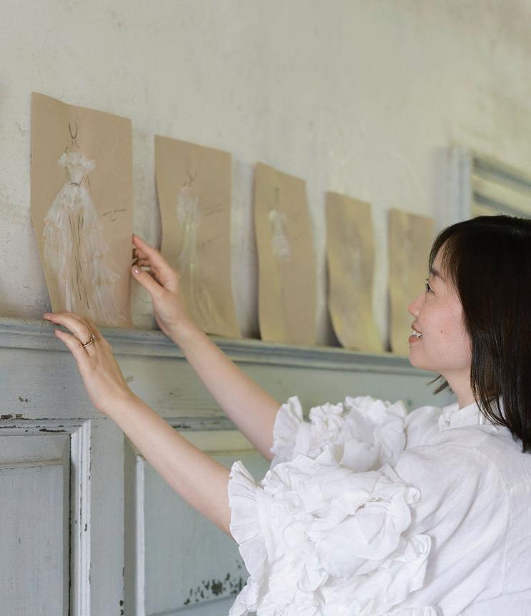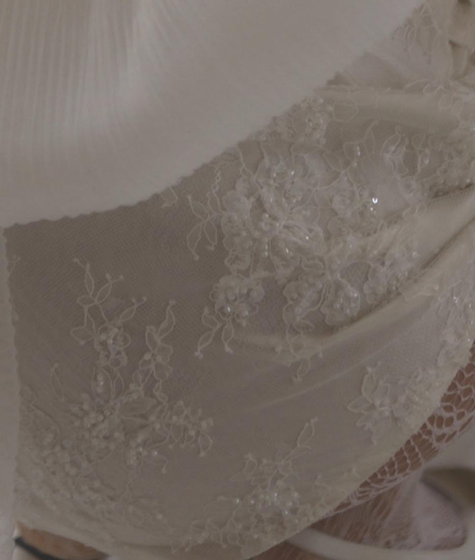 At the heart of the brand’s ethos is a commitment to minimizing environmental impact while maintaining the artistry expected of couture bridal wear. Ouma believes that “true beauty lies not only in the elegance of a wedding dress but also in the journey of how it’s made.” This philosophy guides the atelier’s production process, where fabric remnants are treated not as waste but as creative opportunities. Leftover textiles from each collection are carefully repurposed into accessories and embellishments, ensuring that nearly every material has a second life. Scrunchies, keepsake bags and delicate three-dimensional floral details are all crafted from these remnants, transforming excess material into meaningful design elements rather than discarded waste.