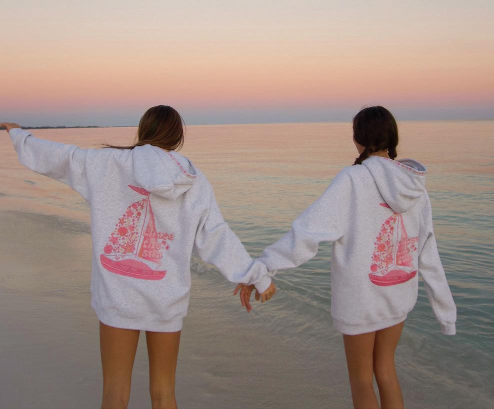 Visually, Pink Palm Puff’s aesthetic is instantly identifiable. Soft, sun-washed palettes, pastel tones and a sense of ease evoke an effortless, aspirational lifestyle. This visual language extends across the brand’s social presence, product imagery and editorial storytelling, creating a cohesive world that fans are eager to inhabit. Whether it’s a lounge-ready hoodie or a chic new swim silhouette, every piece feels curated, intentional and unmistakably Pink Palm Puff.
