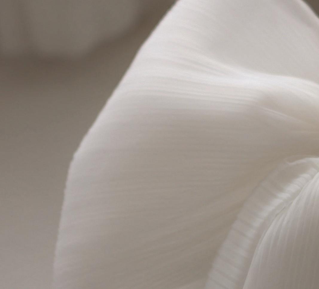 The zero-waste mindset is embedded directly into Ouma’s aesthetic language. Many of the brand’s gowns feature intricate fabric flowers or sculptural accents made from reclaimed materials, blending sustainability with visual richness. Even accessories such as short veils are created through upcycling techniques that give leftover fabrics a new purpose while maintaining the ethereal beauty expected of bridal attire. Through these details, Ouma demonstrates that environmental responsibility can enhance design rather than limit it.