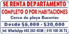 Col. Barrio Santa María, 2 Rec., amueblado, 1 baño, cocina, sala, comedor, 3 a/a, alberca, seguridad, 10 mts. playa, malecón. Contrato largo plazo. $16,000. 322 18 17500.+