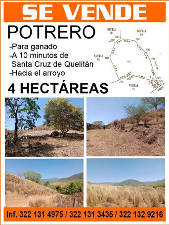 Pilotillo Gargantillo, 150 hectares, communal land in Tomatlán, Highway 200, near a river crossing. $70,000. 322 23 101-37.*