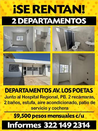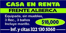 Col. Barrio Santa María, 2 Rec., amueblado, 1 baño, cocina, sala, comedor, 3 a/a, alberca, seguridad, 10 mts. playa, malecón. Contrato largo plazo. $16,000. 322 18 17500.+
