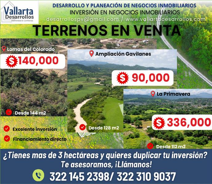 Residential and mixed-use lots for sale, bank financing available, direct financing for 12 months with no interest, attractive discounts for cash payments. Starting at $2,000,000. Info: 322 27 862-99, 322 15 751-08.